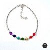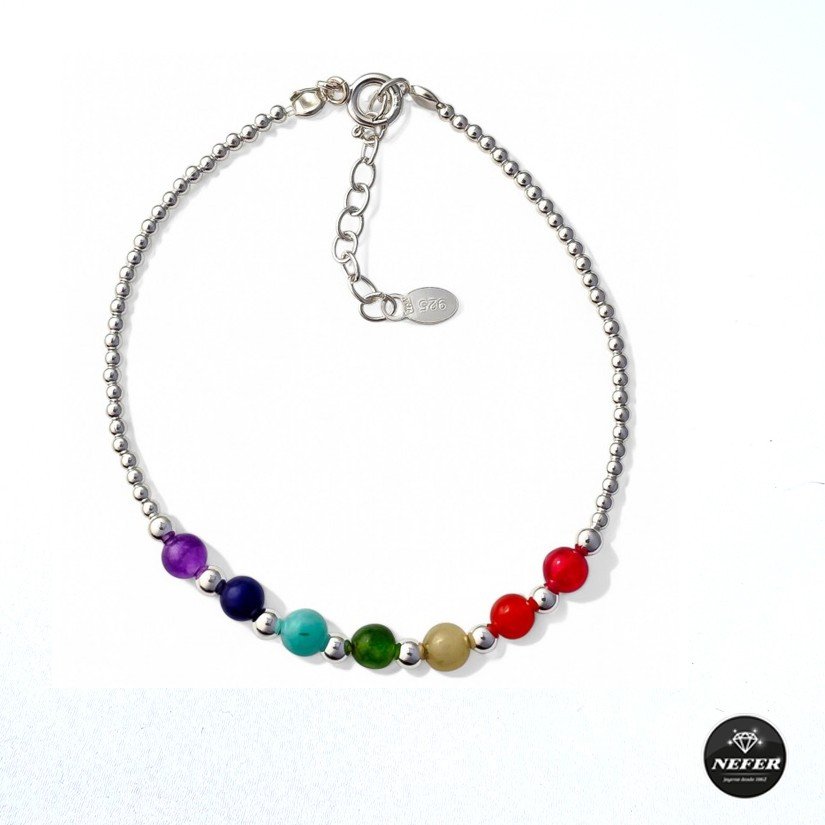 Pulsera plata de ley 925 de 17 cm largo y cadena adaptable de 2.5 cm con motivo de bolas lisas ( 2mm / 3mm ) y bolas color chakras ( 4.5mm ) .