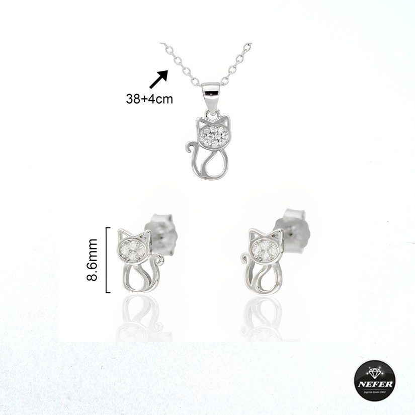 Conjunto en plata de ley motivo gato con circonitas