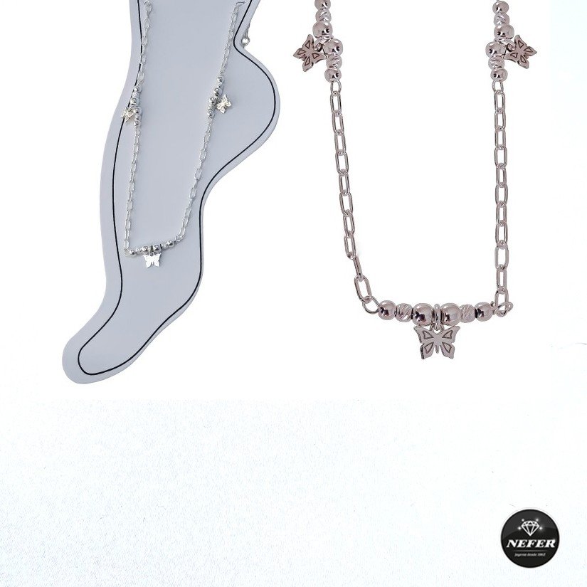 Tobillera plata de ley 925 de cadena forzada de 22 cm largo + cadena adaptable de 3 cm con motivo entre piezas con bolas ( bolas de 3mm y 2.5mm ) y mariposas ( 6mm ) .
